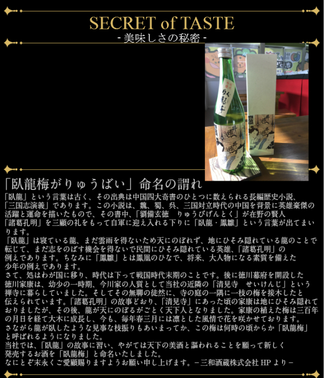 家康の植えた梅は三百年の月日を経て大木に成長し、今も、毎年春三月には凛とした風情で花を咲かせております。 さながら龍が臥したような見事な枝振りもあいまってか、この梅は何時の頃からか「臥龍梅」と呼ばれるようになりました。 当社では、「臥龍」の故事に習い、やがては天下の美酒と謳われることを願って新しく発売するお酒を「臥龍梅」と命名いたしました。 なにとぞ末永くご愛顧賜りますようお願い申し上げます。