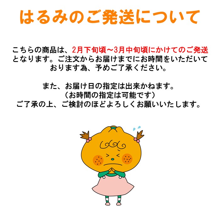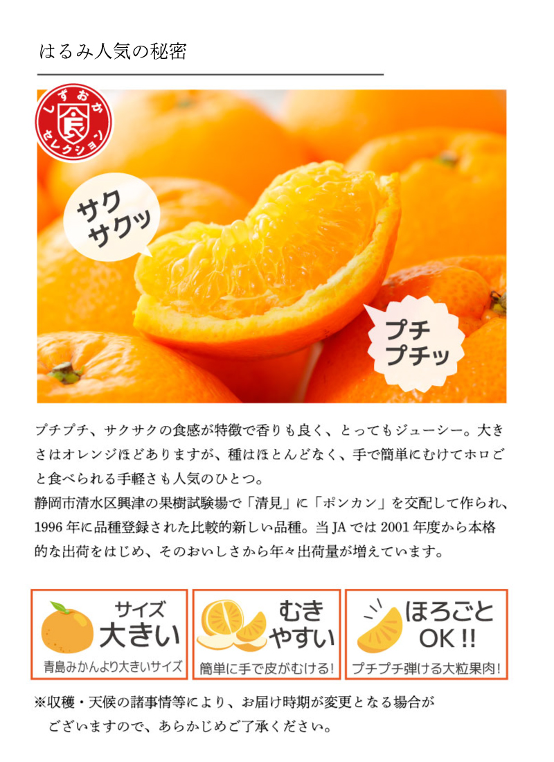 TOP商品一覧 清水生まれの美味しい柑橘「はるみ Princess 5kg入」 価格: ¥6,300 (税込) 販売期間: 2026年01月14日10時00分〜2026年02月10日22時59分 はるみ発送についての注意事項(QueenとPrincess規格): 2月下旬頃〜3月中旬頃にかけてご注文順に発送します。配送日の指定はできません。順番によっては発送開始より2〜4週間かかる場合がありますが、ご了承ください。 選択してください 了承しました 数量: 個 在庫: ○ 在庫 ○ 返品についての詳細はこちら